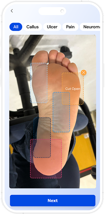 No app download, sensor, or iPad needed. Use any device, and any side camera and let our AI do the rest. Our scanning technology auto-detects ulcers, calluses, and bunions and adds images to your documentation.